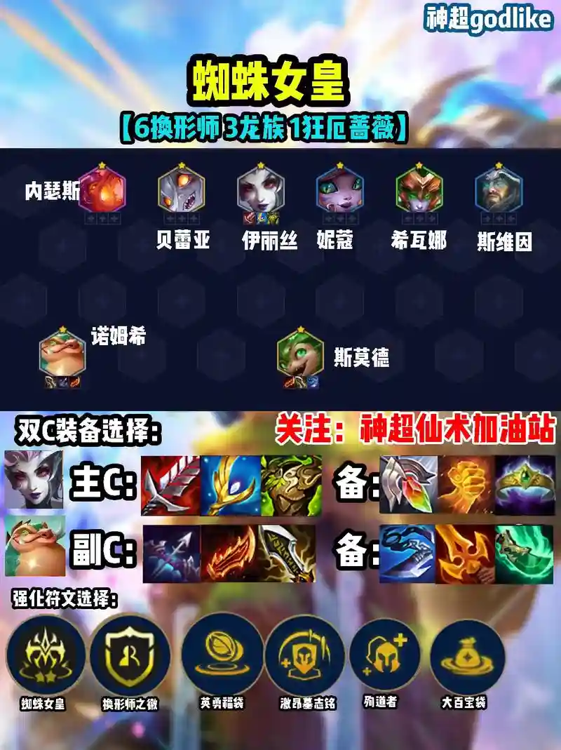 3、【站位一览】女坦和约里克顶在最前排,沙皇是后排输出核心,卡尔玛站在他附近。劫和螳螂这种刺客站在侧翼切入。【羁绊解读】月蚀(2):每过7秒,你的队伍就会获得20%暴击几率、20%暴击伤害和15%法术强度加成。(至多可叠加4层)沙漠(2):削减敌方队伍40%的护甲。