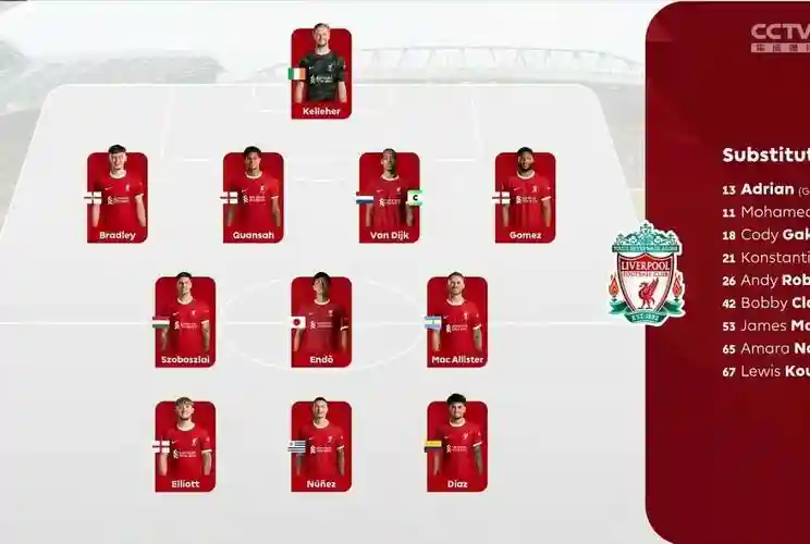 利物浦曼城首发阵容分别为:利物浦首发阵容包括守门员凯莱赫,后卫亚历山大阿诺德、乔戈麦斯、维吉尔范戴克、安德鲁罗伯逊,中场瑞安赫拉芬贝赫、亚历克西斯-麦卡利斯特、默罕穆德萨拉赫、多米尼克索博斯洛伊、科迪加克波,前锋路易斯迪亚兹。