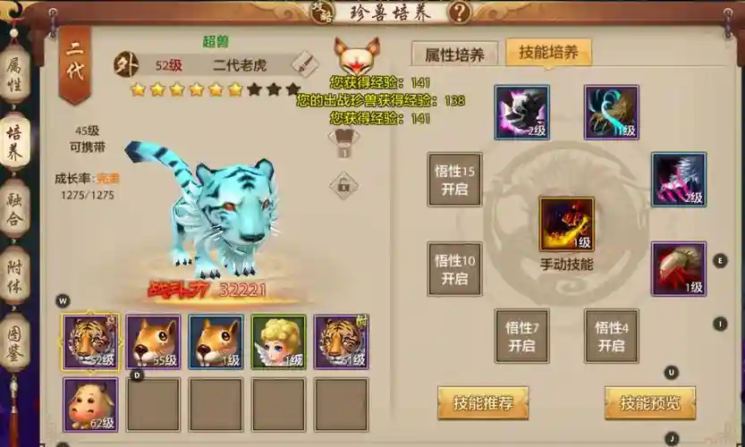 最后上贵的技能,免得先上贵的后再上别的技能把贵的给顶掉。调整完5自动上2手动,那个是100%成功的,不用担心,上高肉墙或高神佑+咆哮。如果不想上咆哮就是上高肉墙+高俯身。技巧这块没有什么,完全靠人品,不过个人感觉下半夜去上技能可以好一点,宝宝上技能前先把悟性提上去也能好一点。