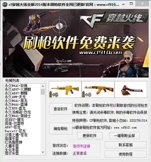 启动游戏后启动软件,按住F10激活后再去查看主武器即可。【使用说明】如果这时候软件上还是显示游戏未连接的话,那么你把CF返回到服务器,在服务器哪里刷新一下进入频道。然后软件上会显示游戏已连接,如果还是显示游戏未连接的话,那么你就把CF关掉,重新打开软件在上游戏,即可刷取武器。