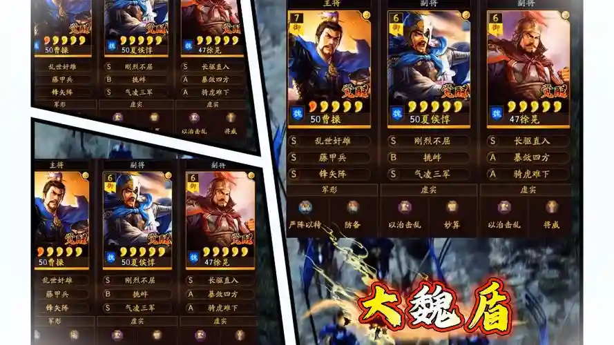 4、曹操+徐晃:曹操作为魏盾的核心辅助武将,能够提供高额的伤害加成和防御加成,与徐晃的搭配能够形成强大的输出能力。第三人选择:典韦/许褚等魏盾武将均可作为第三人选择,根据队伍需要选择合适的技能搭配。