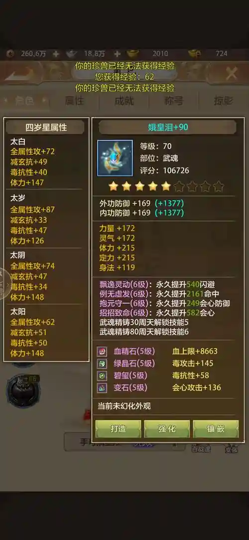 4、凝魂 武魂的每一个岁星的4条属性应该选择火攻击、减火抗、火抗和身法。把4条属性确定好,就可以使用润魂石和铜板给武魂凝魂了。凝魂后,当前岁星的4条属性会随机增减,凝魂后的属性需要保存后才会生效,少侠要选择可以增加战力的进行保存。