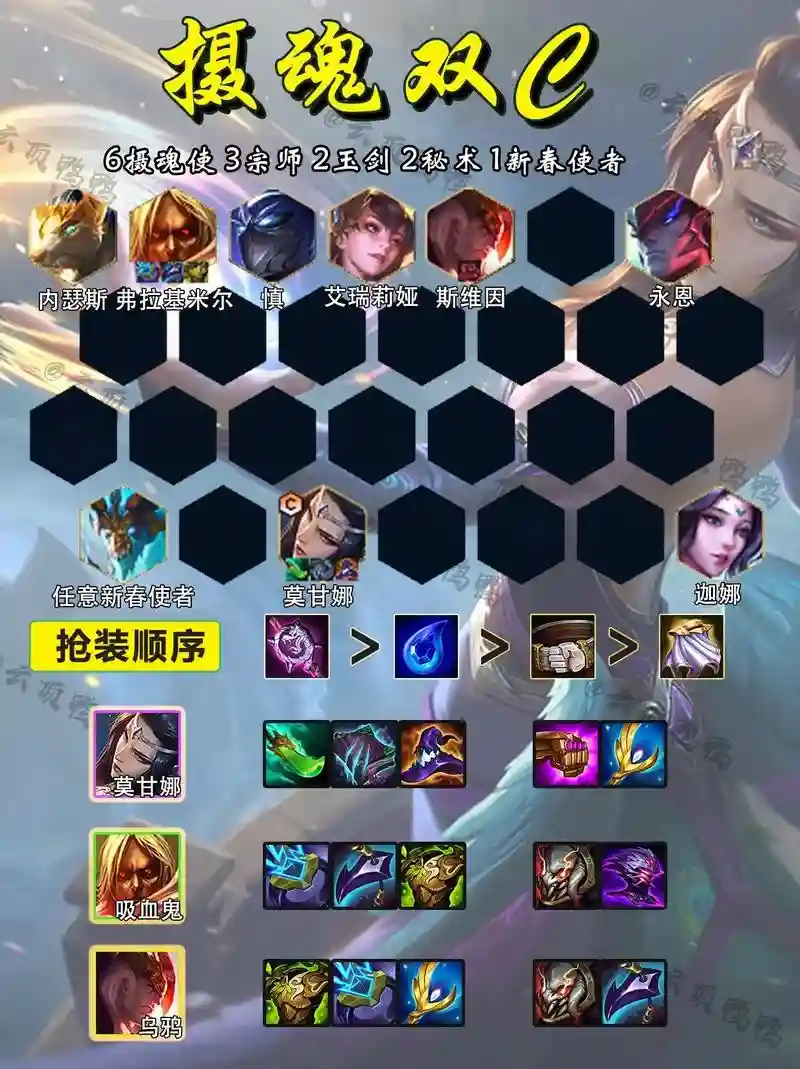 云顶之弈慎玩法攻略:技能介绍:W:奥义!魂佑 慎创造一个领域来环绕自身,允许友军闪避所有攻击。