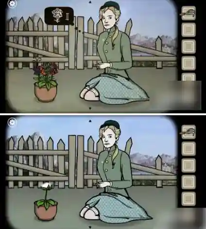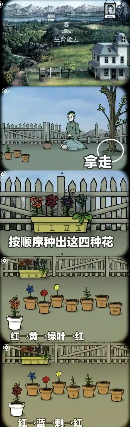 按下面指示的顺序点击相应的花盆(下叶+蓝花+黄花+蓝花),得到深蓝色的花,用耙子把它们带走 把花按顺序种在艾玛旁边的花盆里,然后点击看一朵白色的花 点击白色的花朵,花朵飞向空中,点击女人吸入花朵,盒子出现,这一关通过了。
